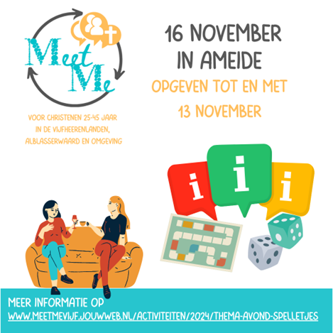 Meet Me is een netwerk voor christenen tussen de 25-45 jaar in de Alblasserwaard, Vijfheerenlanden en omgeving. Op zaterdag 16 november organiseert Meet Me een avond waarbij we nadenken over de impact van getrokken grenzen tussen bevolkingsgroepen. We kijken een documentaire over de situatie in Libanon en praten er over na. Later op de avond zijn er hapjes en drankjes en is er de mogelijkheid om nog een spelletje te spelen. Vind jij het leuk om op een ontspannen manier christelijke leeftijdsgenoten te ontmoeten? Kijk dan op meetmevijf.jouwweb.nl voor alle informatie en meld je aan. Dat kan tot uiterlijk 13 november.
